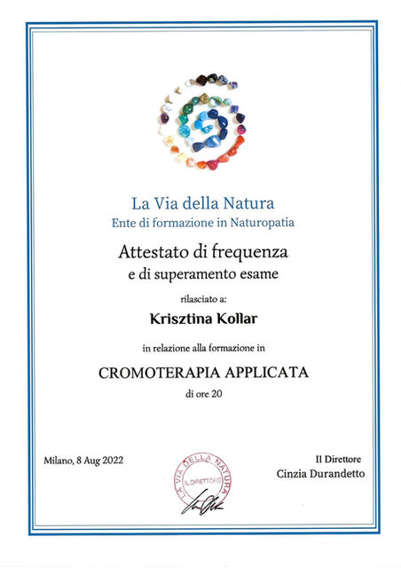 I obtained qualifications in Reiki, vibrational therapy, naturopathy and became an expert in singing bowls, completing my studies at the University of Arezzo. I also explored other techniques such as chromotherapy, moxibustion, metamorphic technique, mesmerism and in 2023 I became a facial reflexologist.