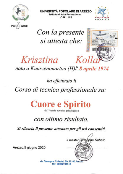 Ho conseguito qualifiche in Reiki, terapia vibrazionale, naturopatia e sono diventata esperta in campane tibetane, completando i miei studi all'Università di Arezzo. Ho anche esplorato altre tecniche come la cromoterapia, la moxibustione, la tecnica metamorfica, il mesmerismo e nel 2023 sono diventata Riflessologa facciale.